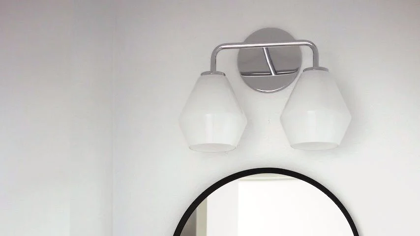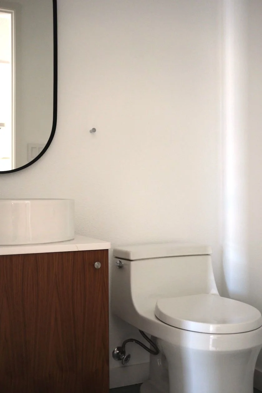 A half bath update from original 1980s fixtures to a modern look. We created a custom vanity from walnut-veneered plywood and quartz countertop, complete with a vessel sink and chrome fixtures. Floor tiles sourced from Heath Ceramics.