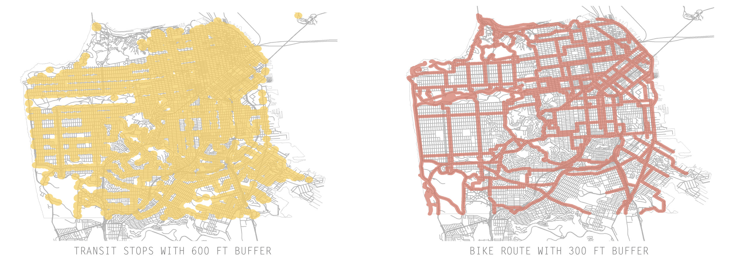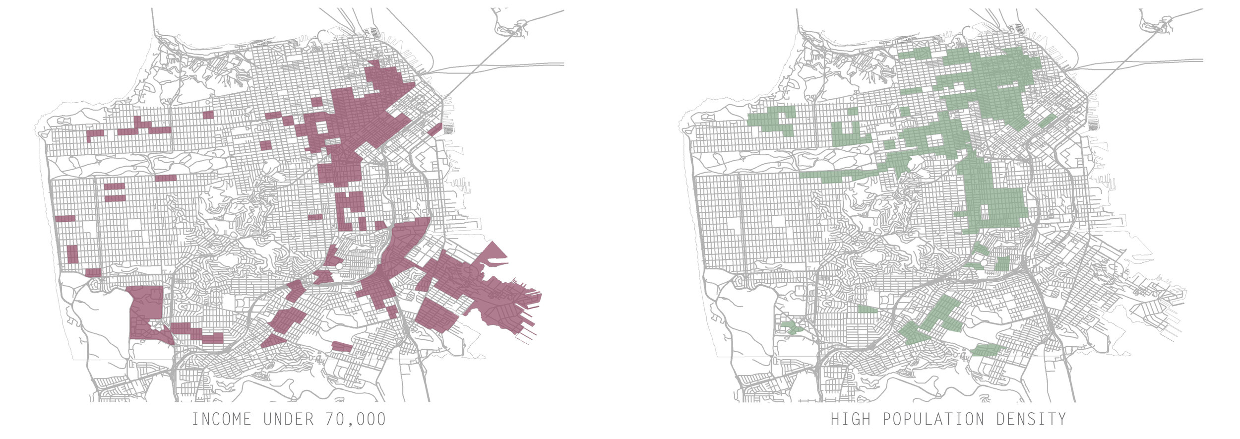 We needed to identify where residents would be optimally served by new community gardens. We considered income, population density, proximity to public transit, and bike accessibility. We made the assumption that low income earners were less likely to own a car and would therefore rely on other means of transport for their daily needs. Additionally, due to the rising cost of living in San Francisco, we considered low income to be annual household earnings under $70,000. The regions highlighted in the diagrams below were all weighted positively in the final suitability analysis.