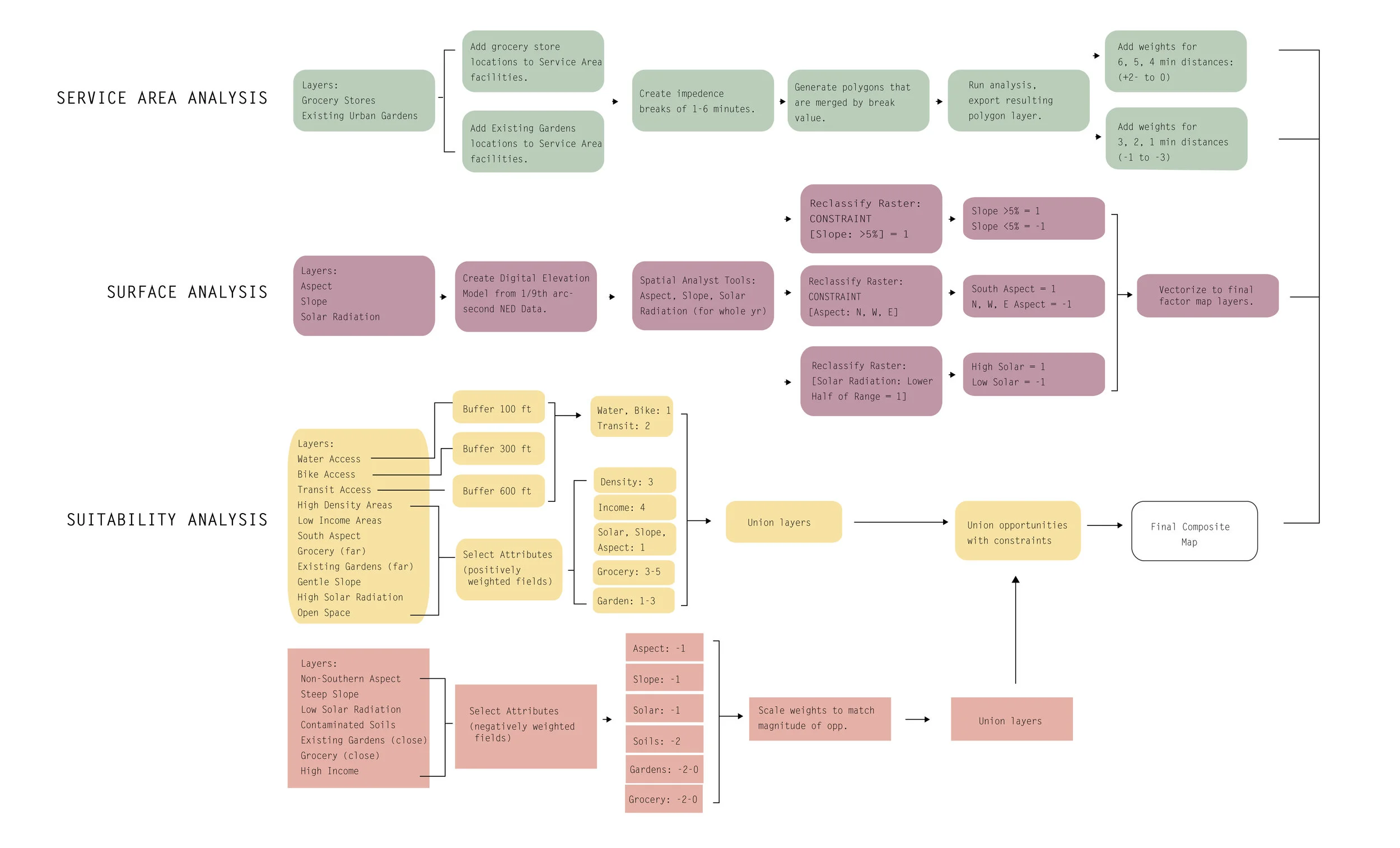 For the final suitability analysis, we combined all 10 layers of data weighted by importance to identify the best locations for new community gardens in San Francisco. The following flowchart describes our process.